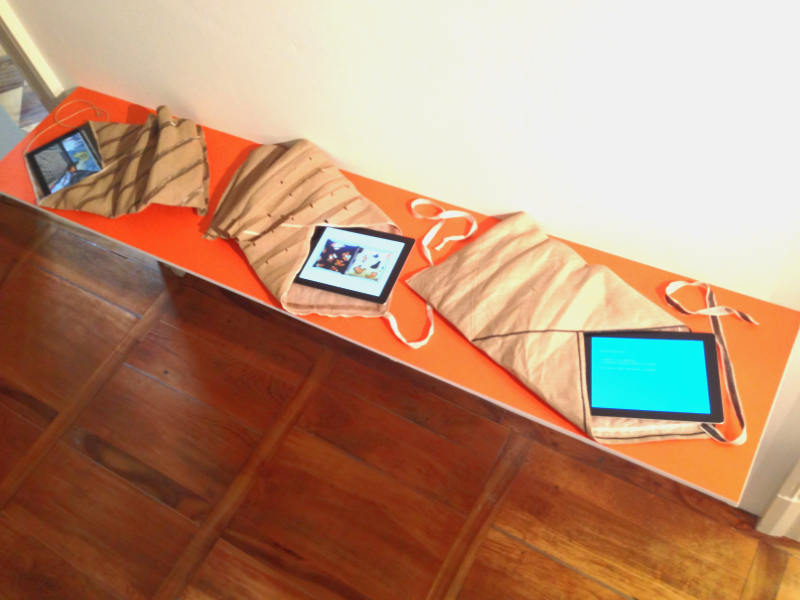 2013 „Dowry Bags“ Museum Bruder Klaus, Sachseln Gruppenausstellung „Weiter im Textil“ Biographische Präsentation: „Dowry Bags“ Inhalt je ein iPad zu den Themen Design – Schulen – Indien. Die Leinentaschen (dowry bags) sind von indischen Mitgift-Taschen inspiriert.