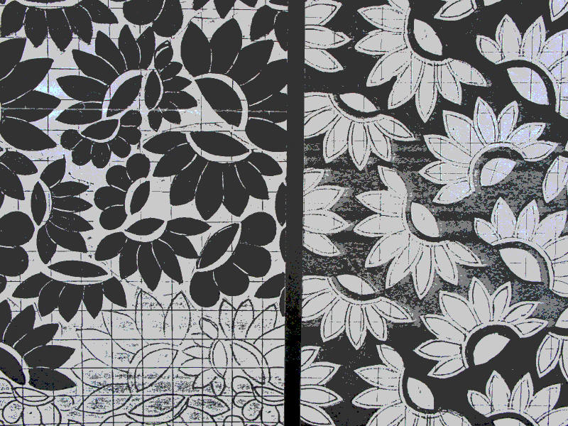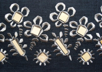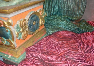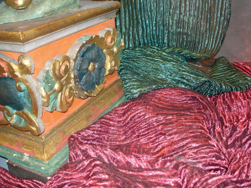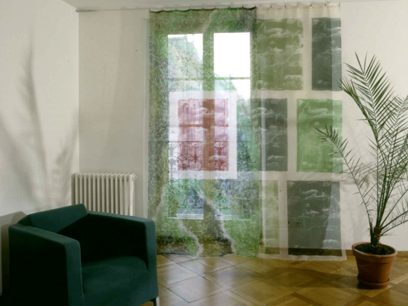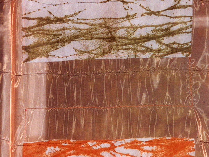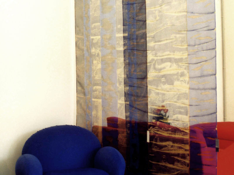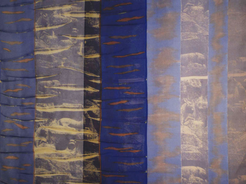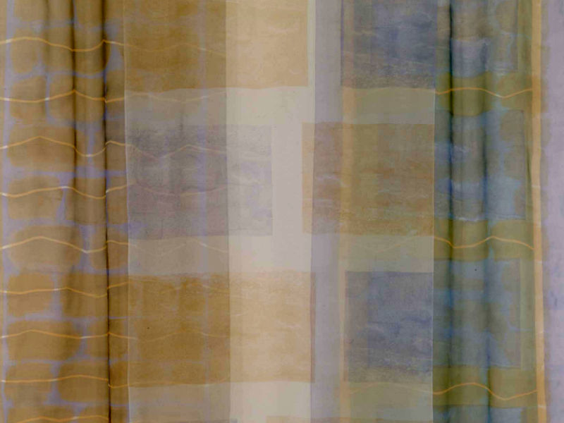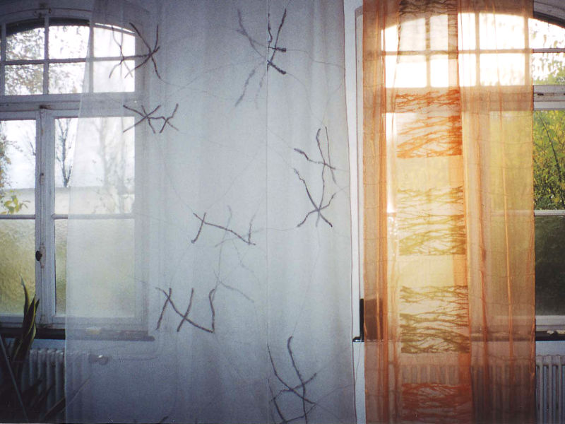 Handbedruckte und bemalte Unikate auf Seide, Baumwolle und Leinen. Produziert in meinem Atelier als Ausstellungsobjekte und für private und öffentliche Räume.
